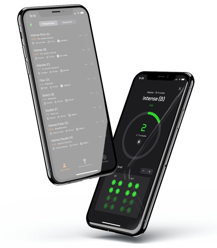 Tous les Reboots mobiles peuvent être facilement contrôlés via l'application Reboots. Cela te permet non seulement d'avoir un contrôle total sur ton massage Reboots, mais aussi d'accéder à d'innombrables fonctionnalités telles que des programmes personnalisables, des réglages personnalisés et des processus de régénération spécifiques à chaque sport.