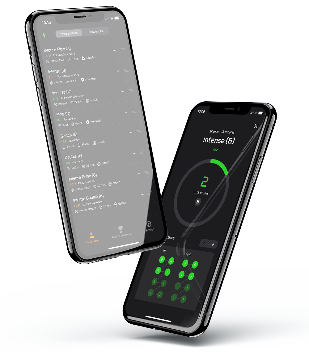 Tous les Reboots mobiles peuvent être facilement contrôlés via l'application Reboots. Cela te permet non seulement d'avoir un contrôle total sur ton massage Reboots, mais aussi d'accéder à d'innombrables fonctionnalités telles que des programmes personnalisables, des réglages personnalisés et des processus de régénération spécifiques à chaque sport.